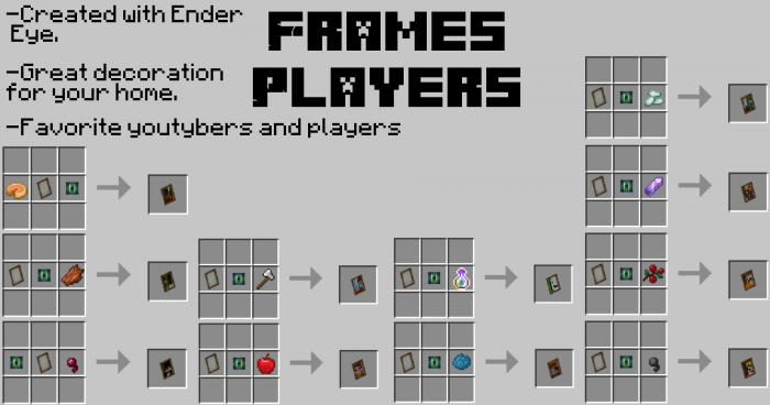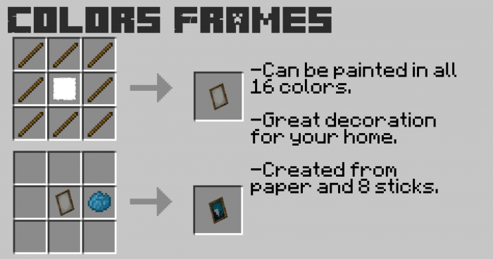 - Colored frames. As you can see from the pictures below, you can craft frames of sixteen different colors